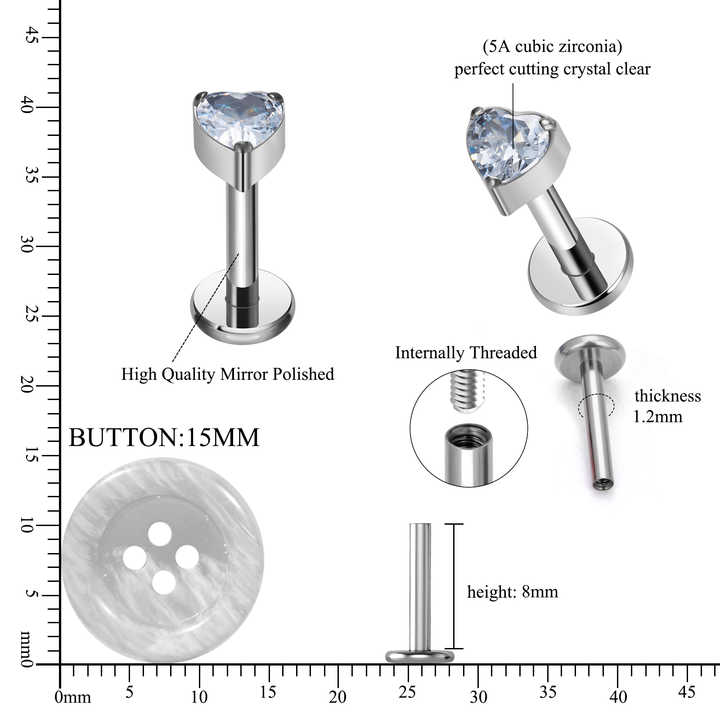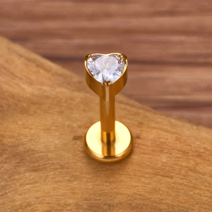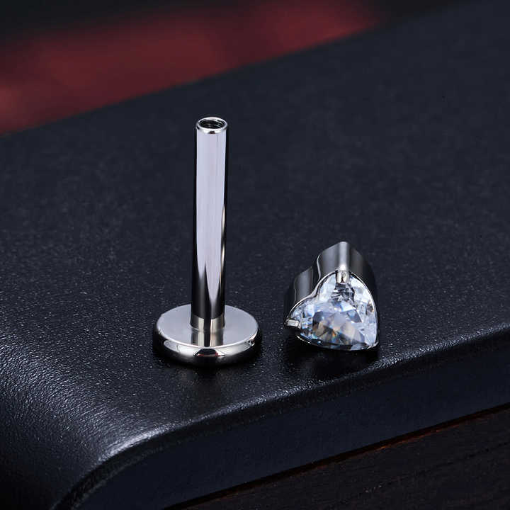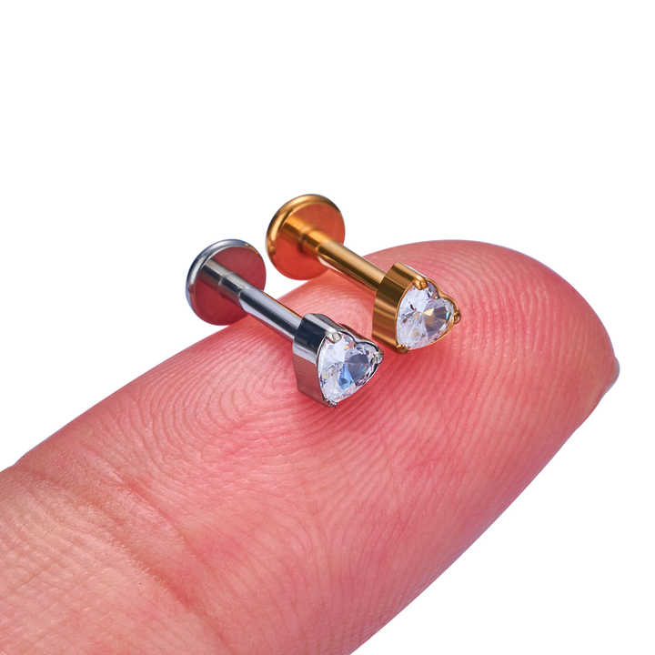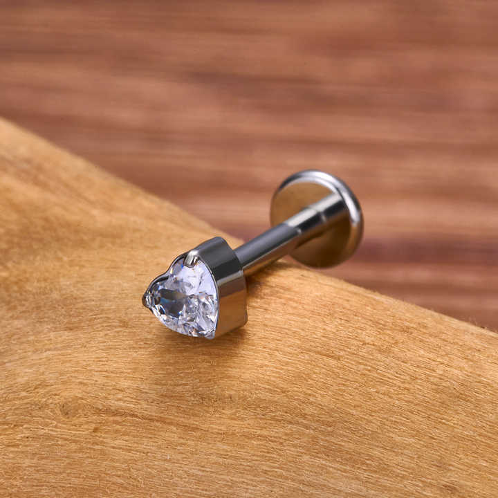 Crafted from hypoallergenic ASTM F136 surgical-grade titanium, this labret stud features a heart-shaped princess-cut zircon secured with micro-insert technology. Ideal for sensitive skin, it suits lip, cartilage, and daith piercings with three size options (1.2x6mm, 1.2x8mm, 1.2x10mm). The punk-inspired design offers 18K gold or silver plating for unisex versatility, blending edgy aesthetics with everyday wearability. Lightweight and corrosion-resistant, its threaded closure ensures a secure fit for active lifestyles. Perfect for gifts, weddings, or self-expression, each piece arrives in compact packaging (8x5x1 cm) with a polished finish resistant to tarnishing. The biocompatible titanium construction prioritizes comfort, while the zircon’s diamond-like sparkle adds luxury to rebellious styling.