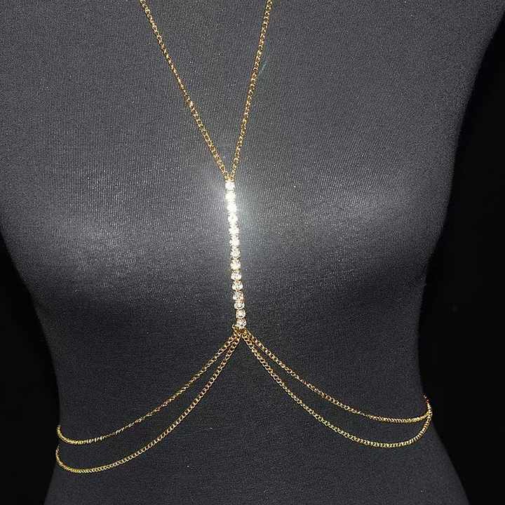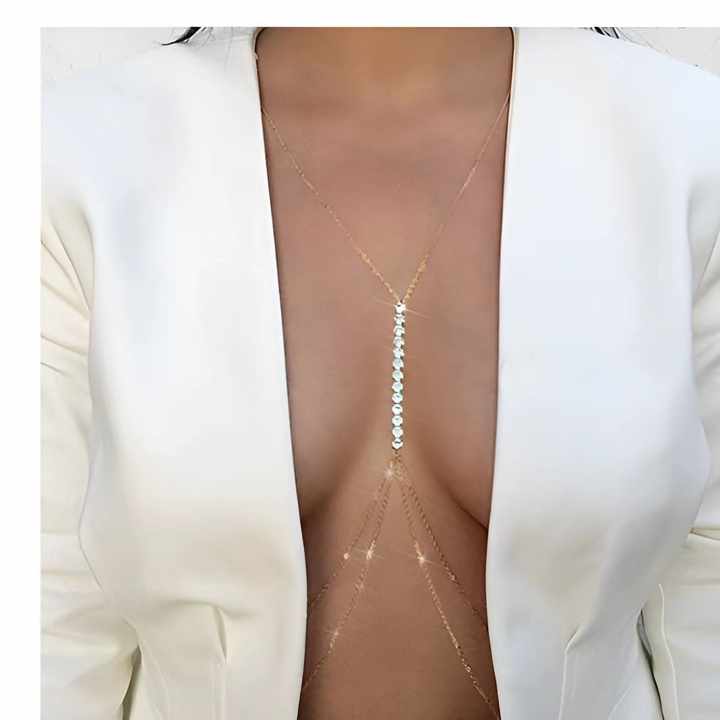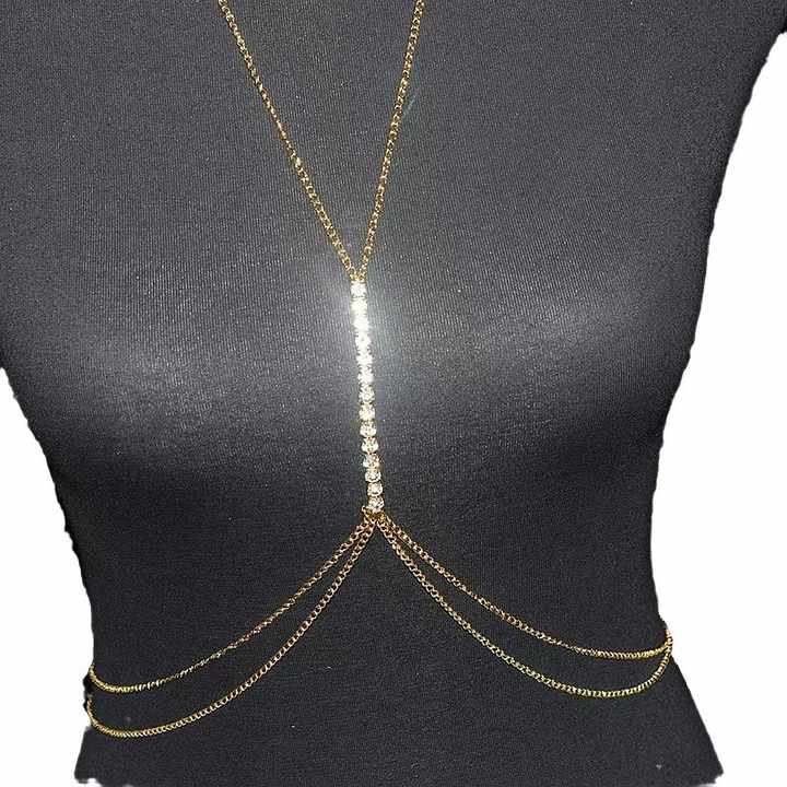 Elevate your style with this exquisite gold-plated body chain, designed for women seeking trendy and elegant jewelry. Crafted from high-quality metal with a lustrous gold plating, this chest chain features dazzling rhinestones and precision-cut crystals arranged in a fashionable claw setting. The adjustable design ensures a perfect custom fit for all body types, making it ideal for parties, evening events, or adding glamour to everyday outfits. Measuring lightweight at just 0.050 kg, the chain sits comfortably while its secure clasp keeps it in place during movement. Each piece comes meticulously packaged in a 10x9x3 cm protective case, ensuring safe delivery. Third-party certified for material authenticity, this body jewelry combines durability with radiant sparkle. Its versatile design transitions effortlessly from clubwear to beach attire or photo shoots. The minimalist yet striking pattern complements necklines and enhances feminine silhouettes. Available as a single-unit purchase, this chain makes an unforgettable gift for birthdays, anniversaries, or self-indulgence. Custom sizing options allow personalized adjustments for unique styling needs. Experience the perfect blend of craftsmanship and contemporary fashion with this statement body accessory.