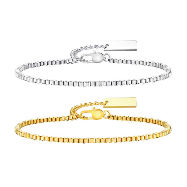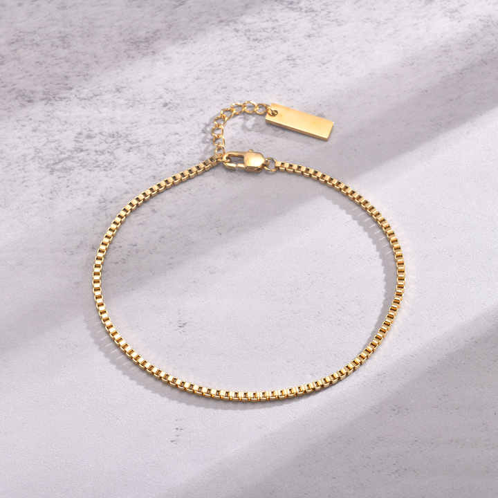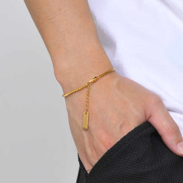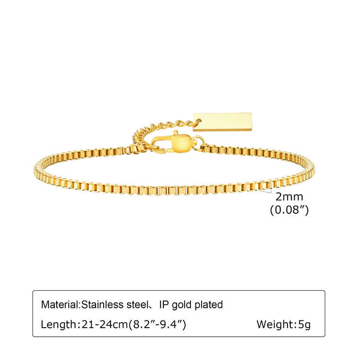 Crafted from durable stainless steel with an 18K gold plating, this minimalist box chain bracelet combines modern geometric square links with a trendy aesthetic. Featuring an adjustable extension chain for a customizable fit, its hypoallergenic material ensures comfort for daily wear. Measuring 13X8X5 cm in packaging and weighing only 6 grams, the lightweight design suits slender wrists while maintaining structural integrity. Ideal for party occasions or elevating casual outfits, the unisex-inspired piece transitions seamlessly from daytime elegance to evening sophistication. Third-party appraisal guarantees quality craftsmanship and metal authenticity. Its versatile minimalist style pairs effortlessly with layered jewelry or standalone statement wear, offering timeless appeal for gifting or personal collection.