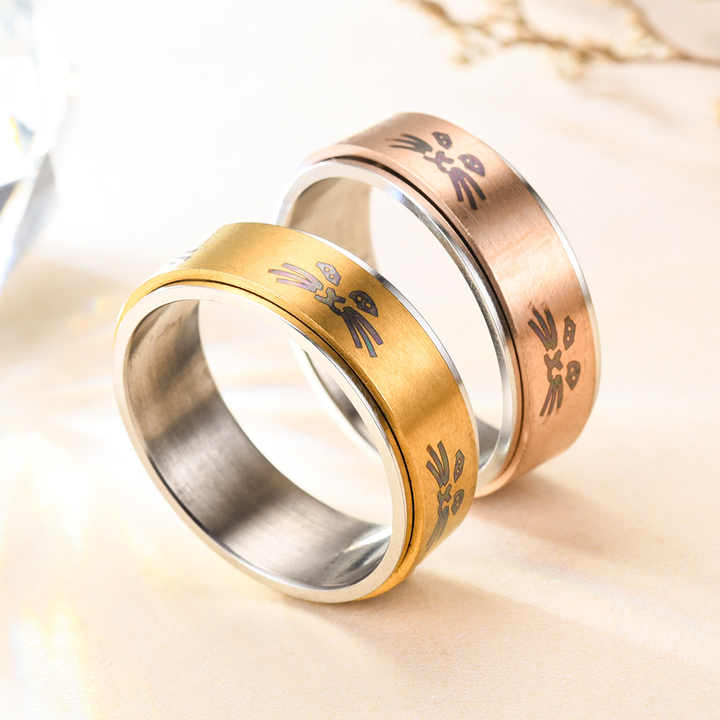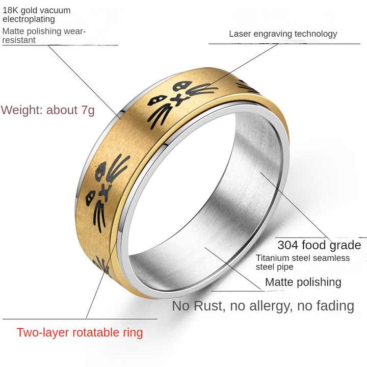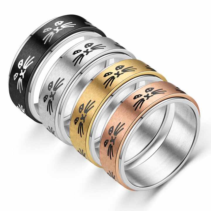 Crafted from durable stainless steel, this rotatable decompression ring combines style with functionality. Designed for unisex wear, it features a unique rotating mechanism that aids stress relief, making it ideal for daily wear or fidgeting. Available in sizes six to nine, it ensures a comfortable fit for most wearers. The electroplated finish offers multiple color options: classic black, sleek silver, warm gold, and romantic rose gold, all resistant to fading and tarnishing. Its minimalist bar setting design complements casual and formal outfits, suitable for parties, anniversaries, or as thoughtful gifts. The hypoallergenic material guarantees safety for sensitive skin, while the laser-engraved cat motif adds a playful touch. Weighing only 0.005 kg, this lightweight ring integrates animal-inspired metal elements for modern appeal. Packaged in a 1x1x1 cm protective case, it arrives ready for gifting. Perfect for those seeking practical jewelry that balances therapeutic benefits with contemporary aesthetics.
