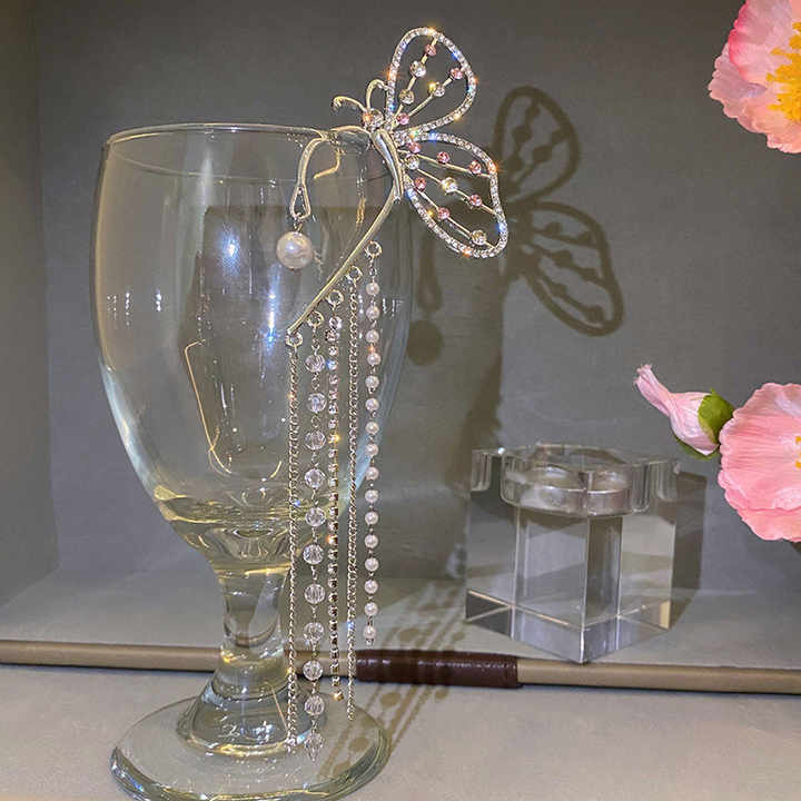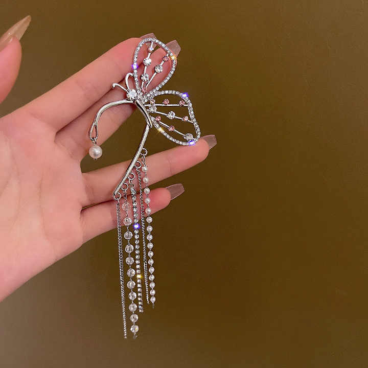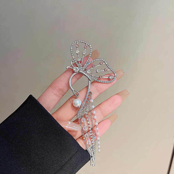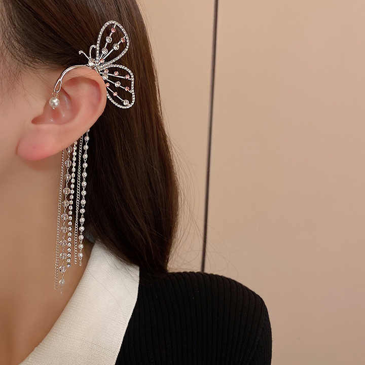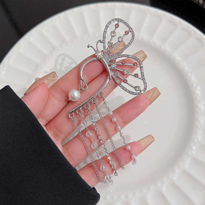 Elevate your style with these exquisite non-piercing clip-on earrings featuring a delicate butterfly design adorned with sparkling zircon stones and lustrous imitation pearls. Crafted from gold-plated metal with a secure bezel setting, these ear cuffs combine durability with lightweight comfort (0.15 kg). The 5x5x1 cm dimension ensures a noticeable yet elegant presence, while the long tassel detail adds graceful movement. Ideal for sensitive ears, these unisex earrings require no piercing and maintain their shine through scratch-resistant plating. The versatile trendy design transitions effortlessly from daytime wear to special occasions, making them perfect for parties, weddings, or as a thoughtful gift. Each piece showcases meticulous craftsmanship with oval-cut zircon stones surrounded by pearl beads, creating a harmonious blend of modern and classic elements. The adjustable clip backing ensures secure fit for most ear types. Maintain brilliance by gently cleaning with a soft cloth and storing in dry conditions. Package includes one carefully protected ear cuff ready for gift-giving.
