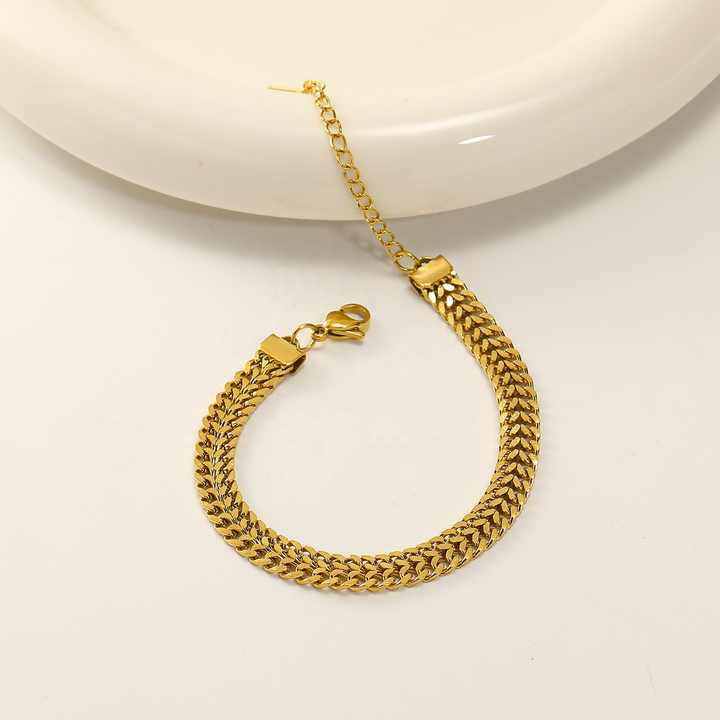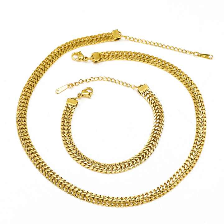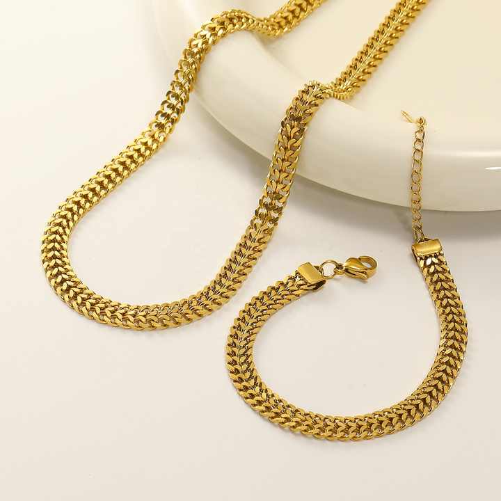Crafted for the modern woman, this trendy stainless steel jewelry set features 18K gold plating for a luxurious tarnish-resistant finish. The matching necklace and bracelet showcase a bold double Cuban curb chain design with flat links, offering a sophisticated lay-flat fit ideal for daily wear. Hypoallergenic stainless steel construction ensures comfort for sensitive skin while resisting corrosion and fading. Perfect for weddings, anniversaries, graduations, or parties, this versatile set transitions seamlessly from casual to formal attire. The secure lobster clasp and adjustable chain lengths provide customizable sizing. Includes third-party certification for quality assurance. Designed with card-setting technology for added durability, this jewelry set arrives in protective packaging ready for gifting. Its neutral gold tone complements all skin tones, making it a timeless addition to any wardrobe. The 5mm chain width offers substantial presence without weight, while the interlocking Cuban links create eye-catching texture. An essential accessory for fashion-forward individuals seeking jewelry that combines contemporary style with lasting wearability.